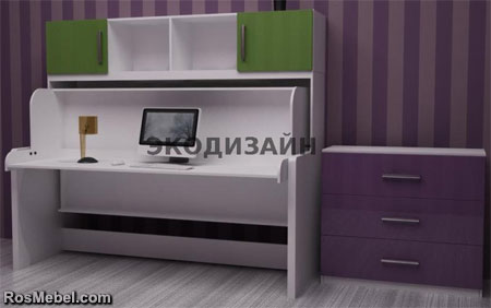 Данная модель сочетает в себе два полноценных мебельных изделия : рабочий письменный стол и кровать с ортопедическим матрацем. Кровать-стол оборудована надежным немецким механизмом трансформации с газовыми пружинами, который позволяет использовать ее днем в качестве полноценного рабочего места, а ночью превращает в полноценную кровать с ортопедическим матрацем шириной 90 или 140 см. При этом нет необходимости каждый раз убирать со стола все принадлежности, поскольку во время трансформации столешница всегда остается в горизонтальном положении. Вы даже можете оставить чашку чая на столе, и ни одна капля из нее не прольется. Безусловно, это наиболее удачный и бескомпромиссный вариант для детских и подростковых комнат. Кровать-стол от компании Экодизайн обеспечит Вашего ребенка полноценным рабочим и спальным местом и предоставит больше свободы в его жизненном пространстве.